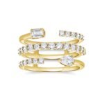 Experience the epitome of luxury with the Swarish Jewels Multishape Triple Row Diamond-on-Diamond Statement Silver Ring. Crafted with precision in Sterling Silver and dipped in 14k gold, this ring is a true masterpiece of artistry and sophistication.